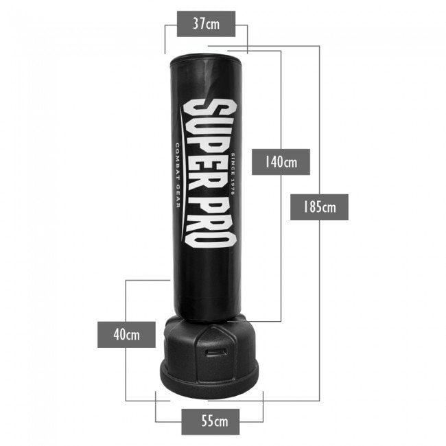 Deze bokspaal is gemaakt van een hard plastic als basis die gevuld dient te worden met grind of zand. Deze basis staat zeer stabiel tijdens de training. Het deel waartegen je kunt slaan en trappen is van een zeer sterk kunstleder gemaakt waardoor de staande bokszak enorm slijtvast is. De binnenzijde is geproduceerd van meerdere lagen polyethaan schuim. Dit schuim is zeer flexibel waardoor het telkens weer terug komt en er geen gaten ontstaan. Deze staande bokszak van Super Pro is mede zo fantastisch in gebruik door zijn grote stoot oppervlak. De deel waar je zowel je high kicks, low kicks als ook de slagen perfect op kunt trainen is maar liefst 140 cm lang en heeft een diameter van 37 cm waardoor de staande bokszak ook nog eens breder dan normaal is. De voet is ongeveer 40 cm hoog waardoor de staande bokszak in totaal 186 cm hoog is. De voet heeft een diameter van 58 cm.
